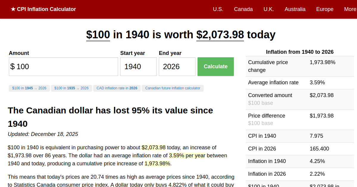 Value Of 1940 Canadian Dollars Today Canada Inflation Calculator